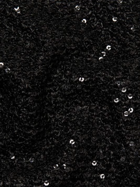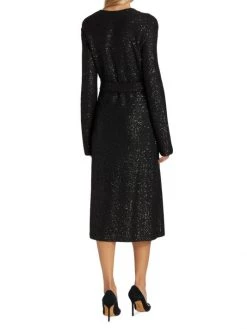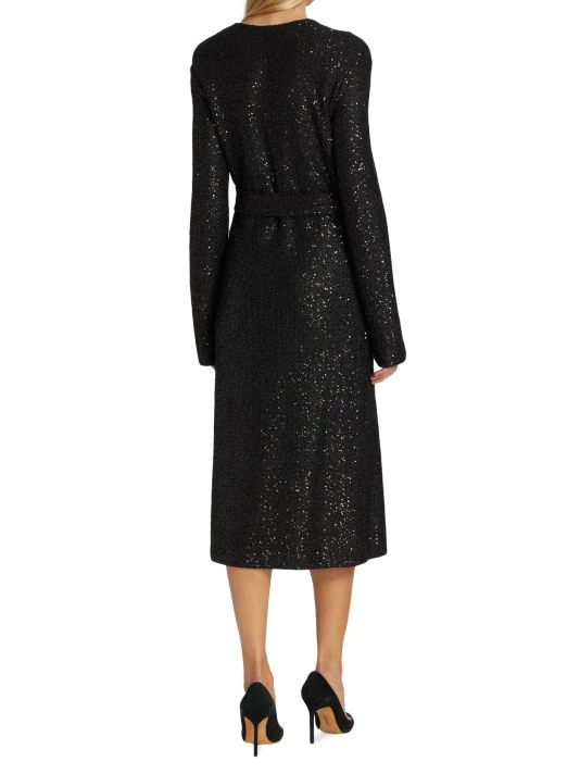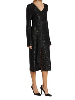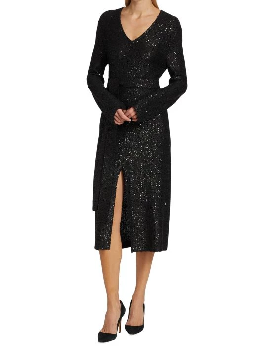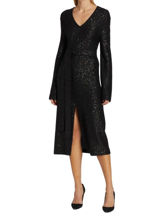 This sequined knit midi dress features a front knee-high slit and a self-tie belt.