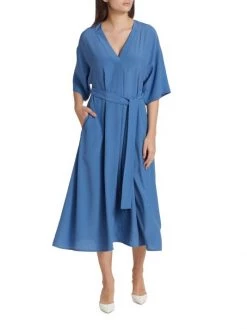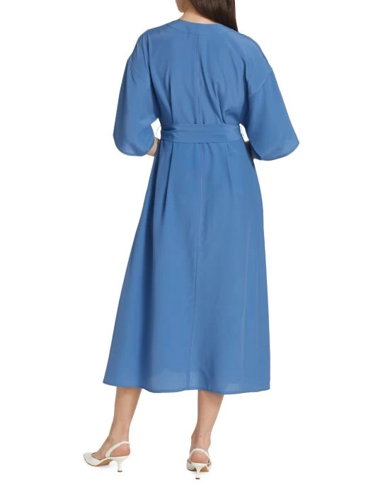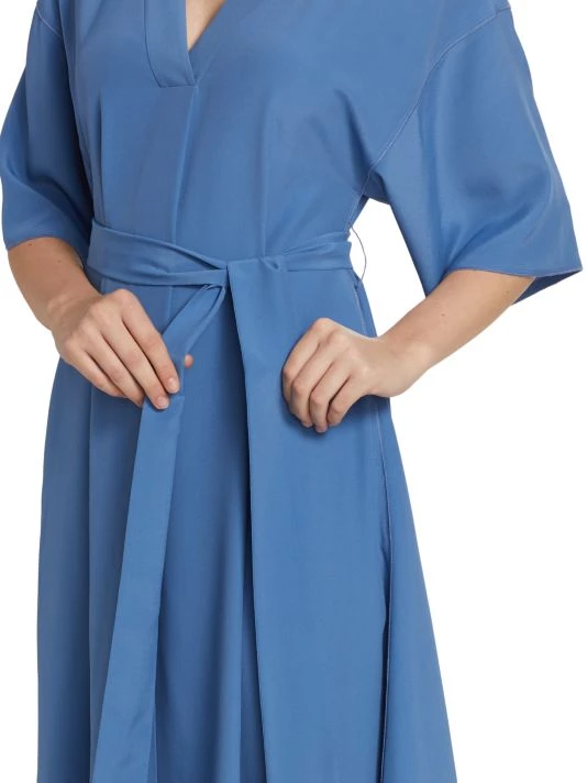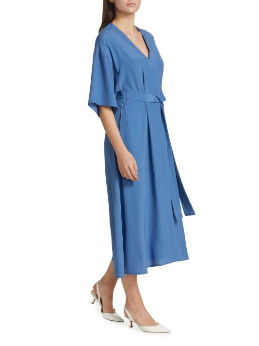 Crafted of a silk blend, St. John’s V-neck midi-dress is defined by a tonal sash belt.