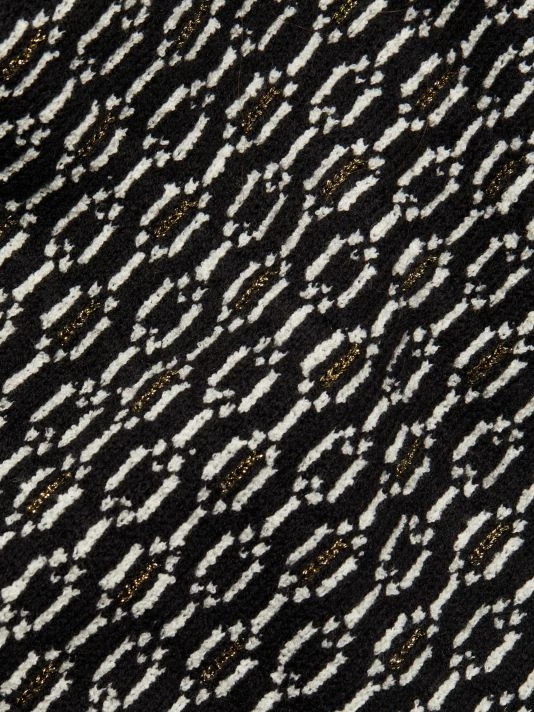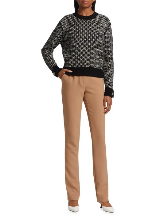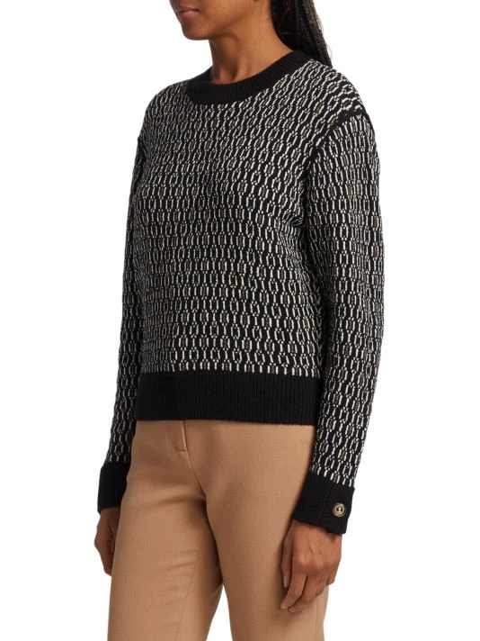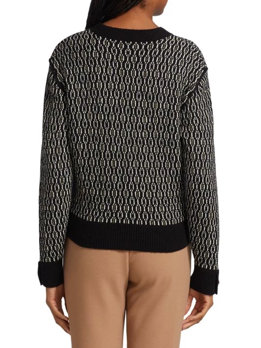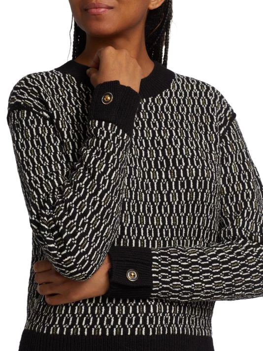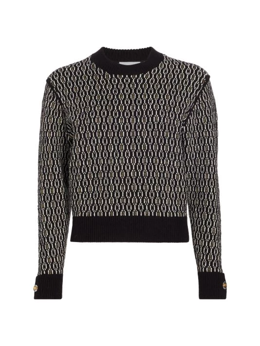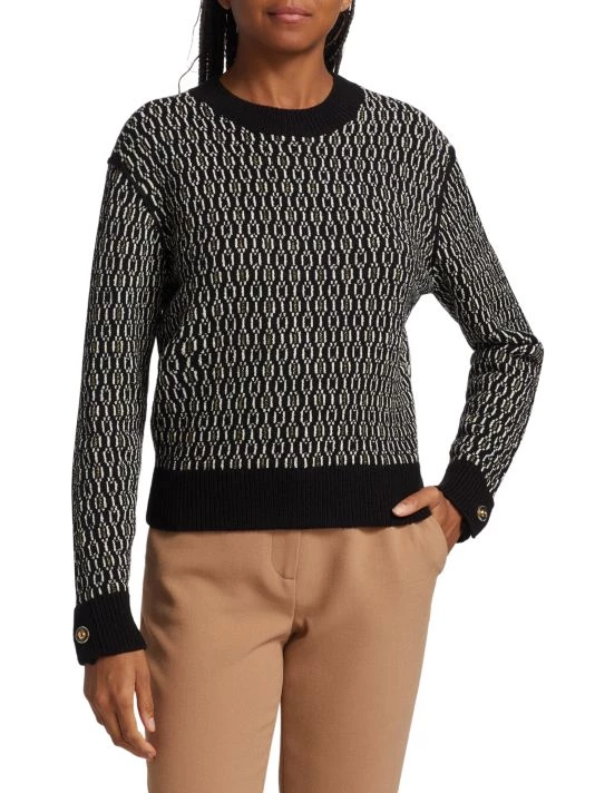 An intricate bouclé chain stitch lends dimension to St. John’s contrast-trim sweater, designed with button cuffs.