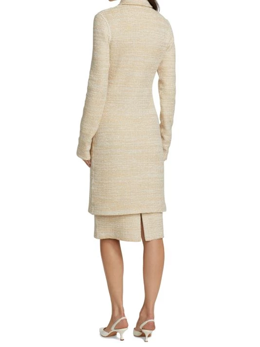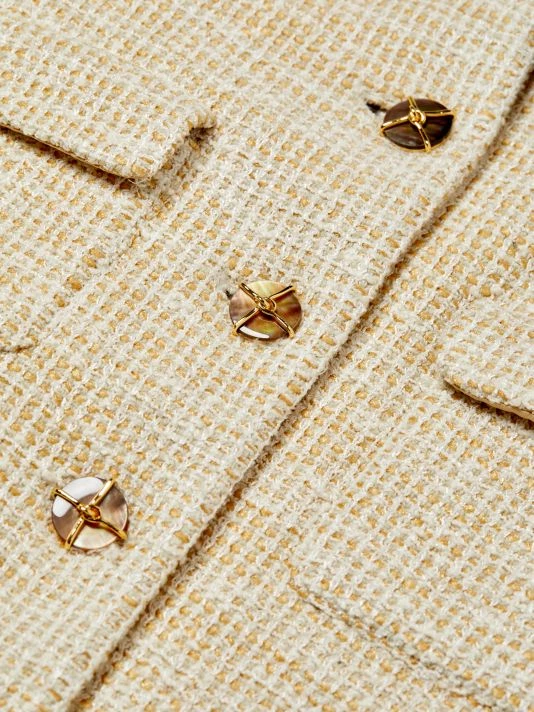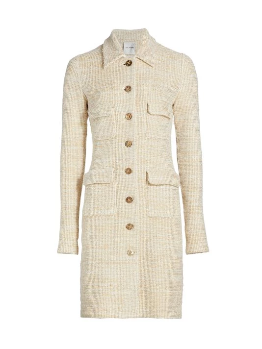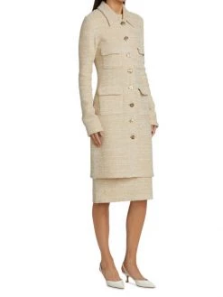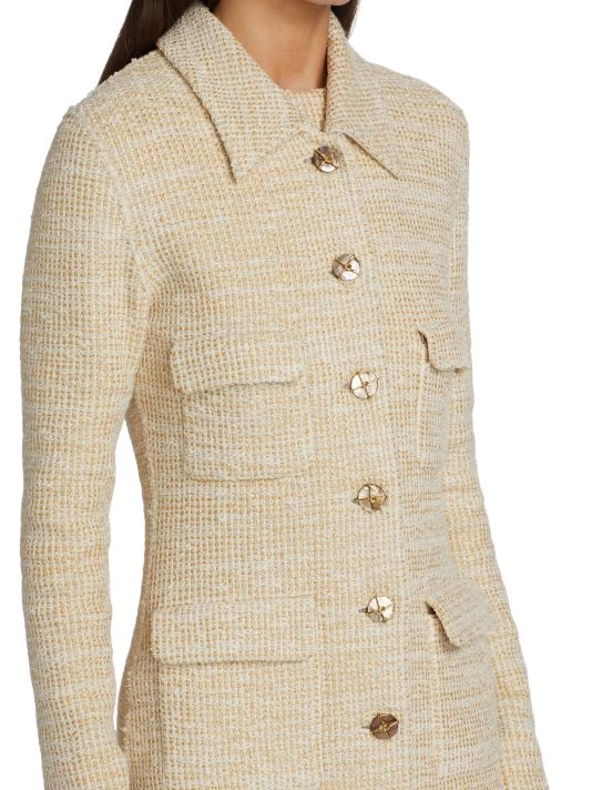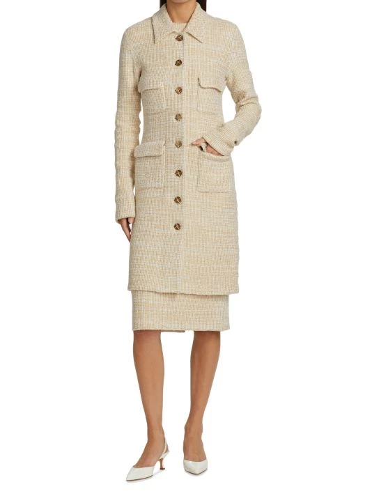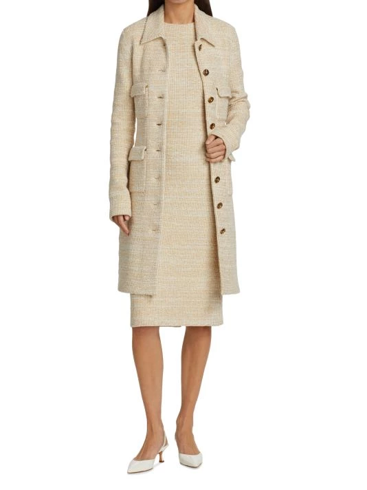 Long boucle knit coat with four front flap pockets and contrast goldtone button front.