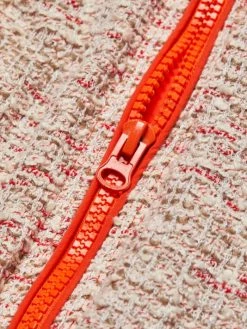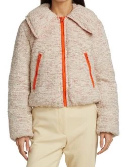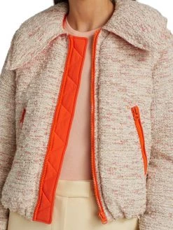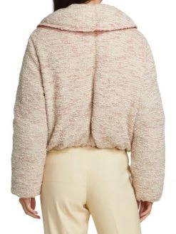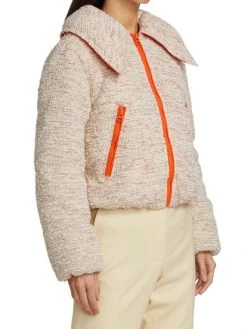 Boucle knit cropped puffer jacket with bomber-inspired, utilitarian detailing.