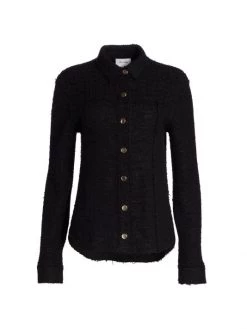Boucle knit top in a shirt-inspired silhouette with iridescent button embellishments.