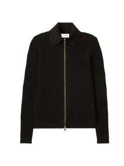 St. John’s zip-front cardigan is elevated by a brand-embroidered collar and textured cable knitting.