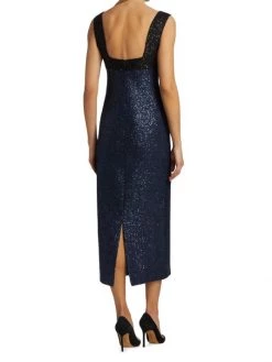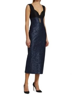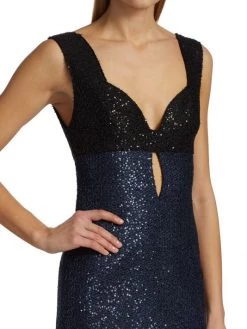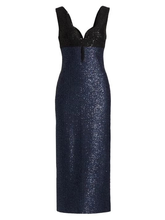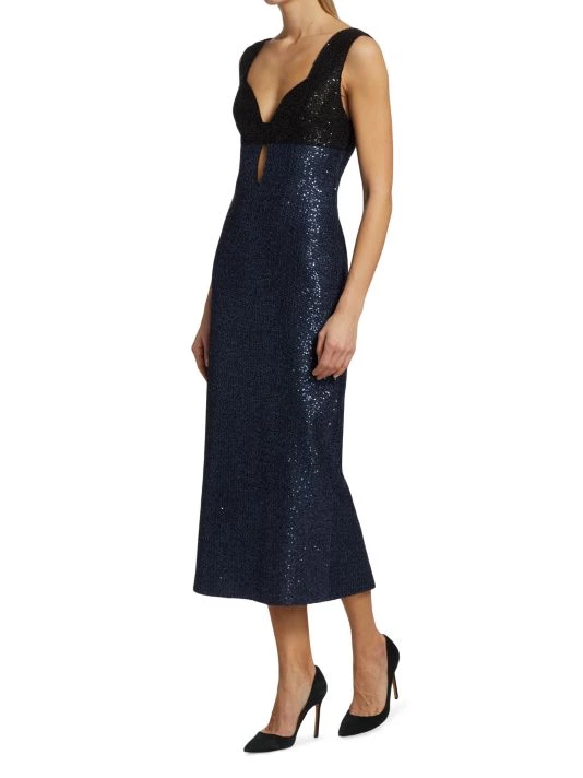 Cut in a formfitting silhouette, this sleeveless colorblocked midi-dress is defined by lustrous sequin embroidery and a structured plunging V-neck.
