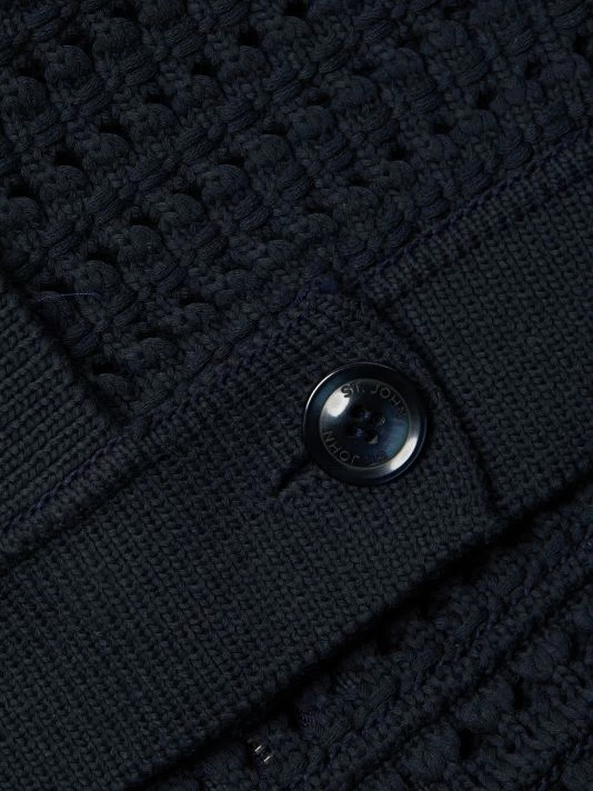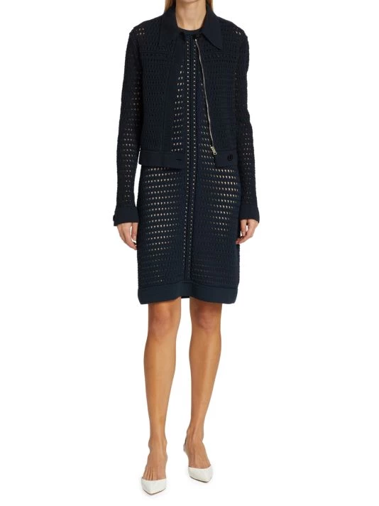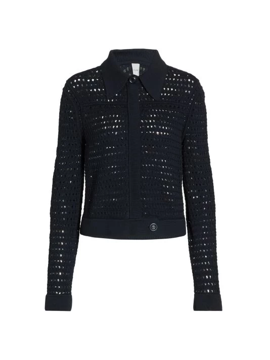 Lightweight zip-up sweater with openwork crochet knitting and contrast banded rib trim.
