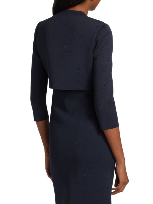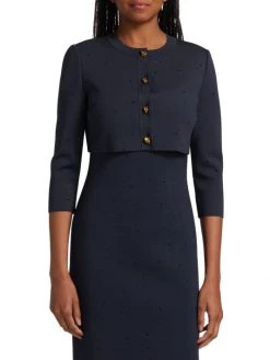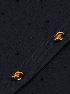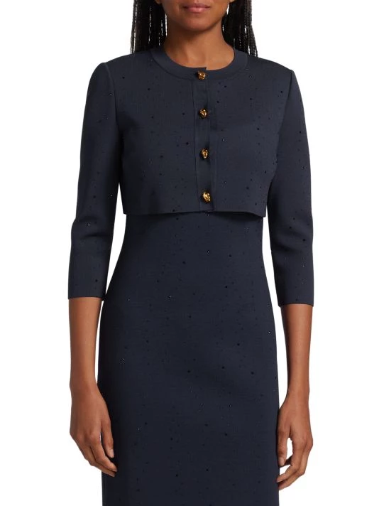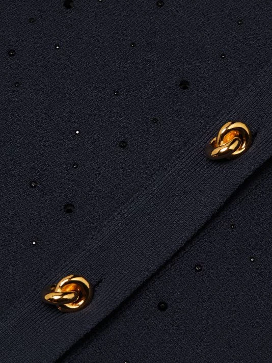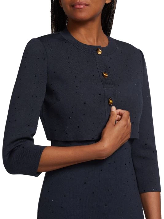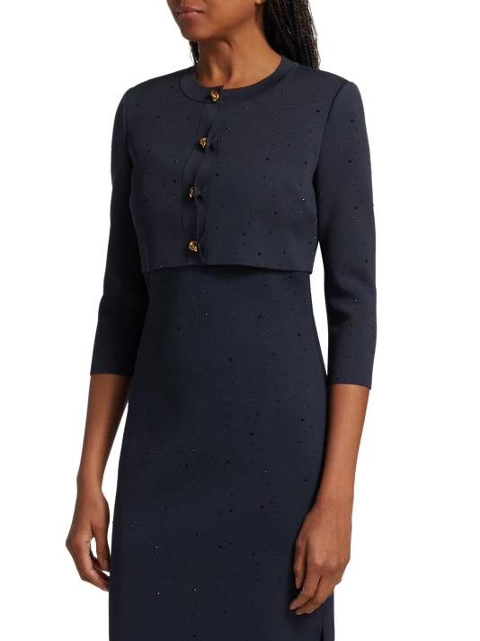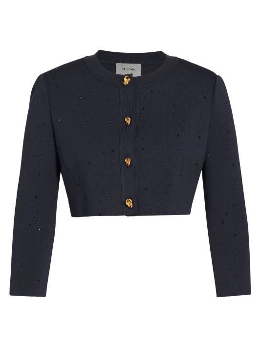 Knotted goldtone buttons center St. John’s crystal-studded double-knit cardigan.