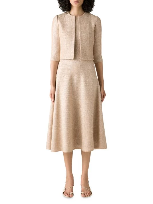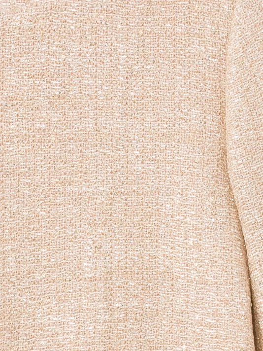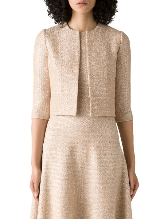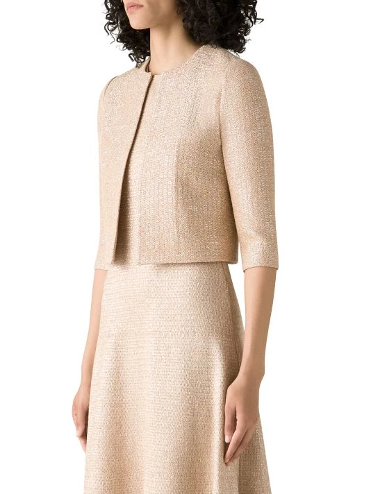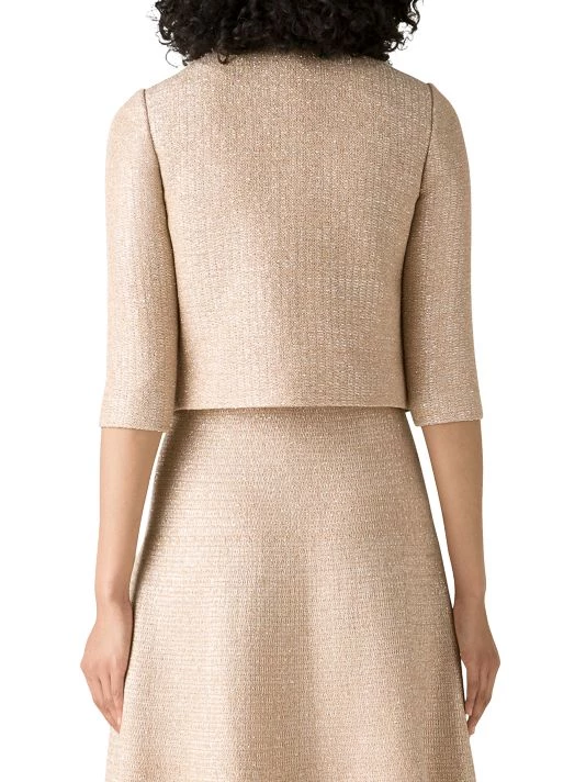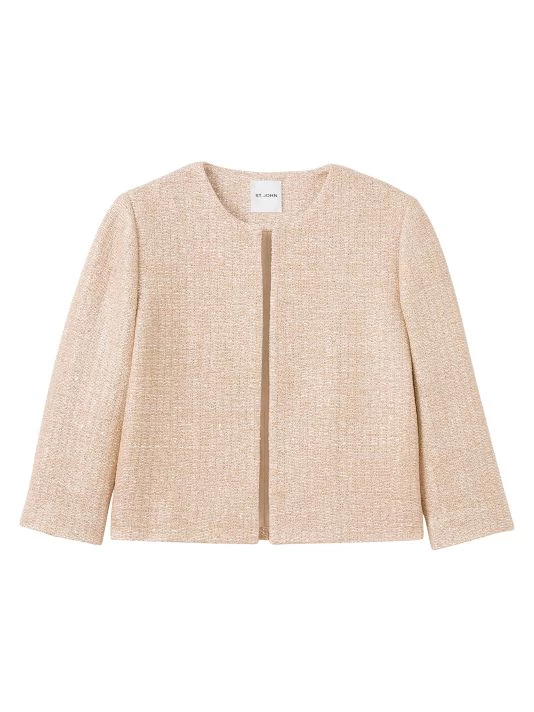 Cut in a cropped silhouette, St. John’s open-front jacket boasts subtle metallic knitting.