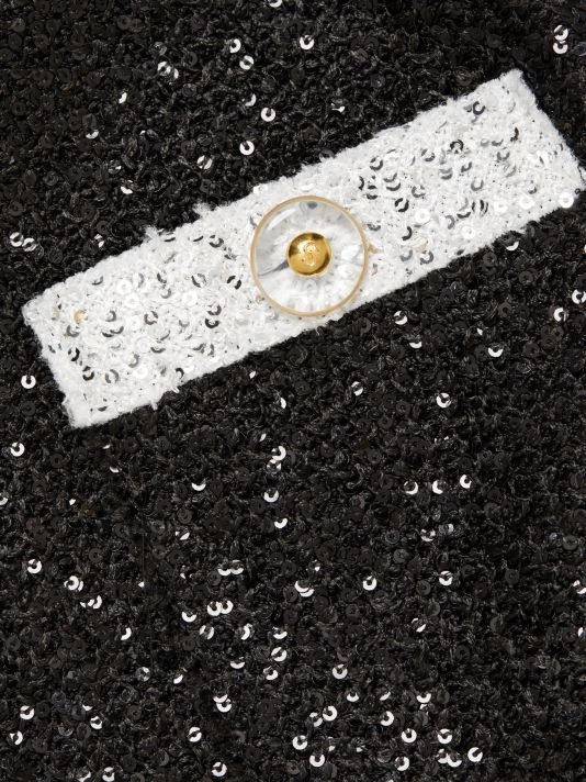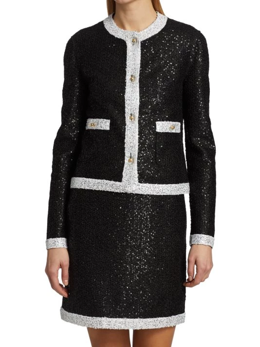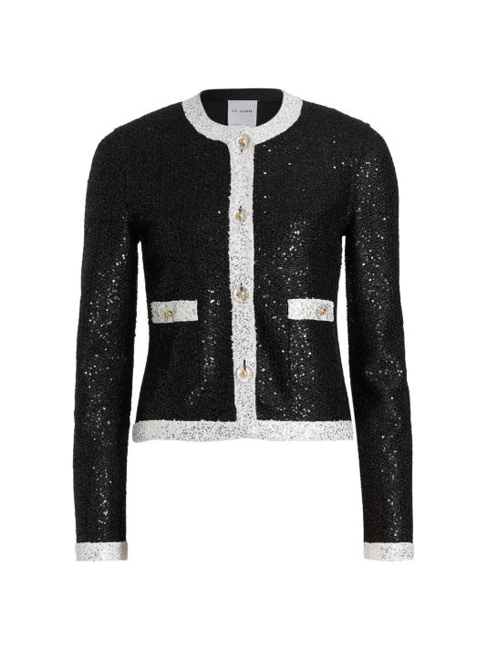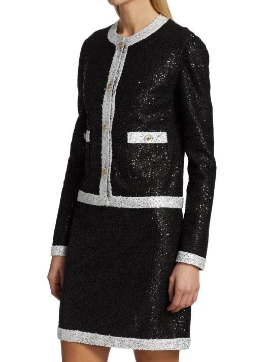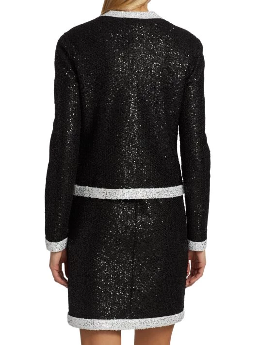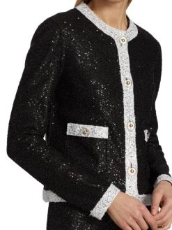 This sequin-embellished knit jacket is complete with goldtone button closures and contrast trim.
