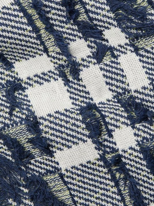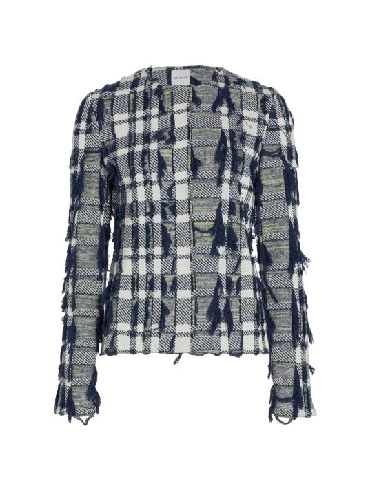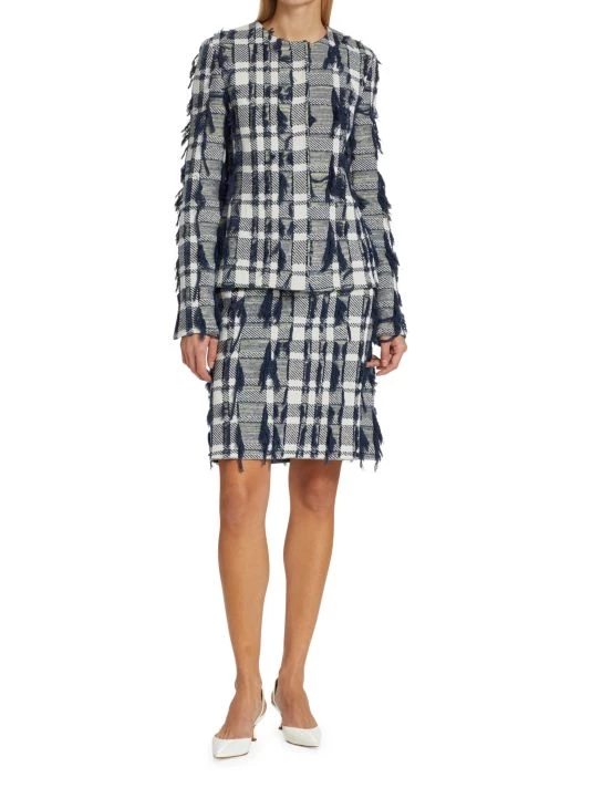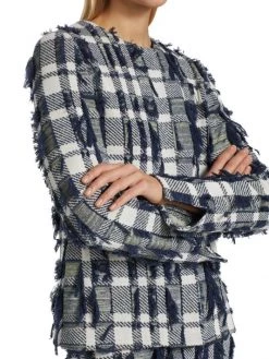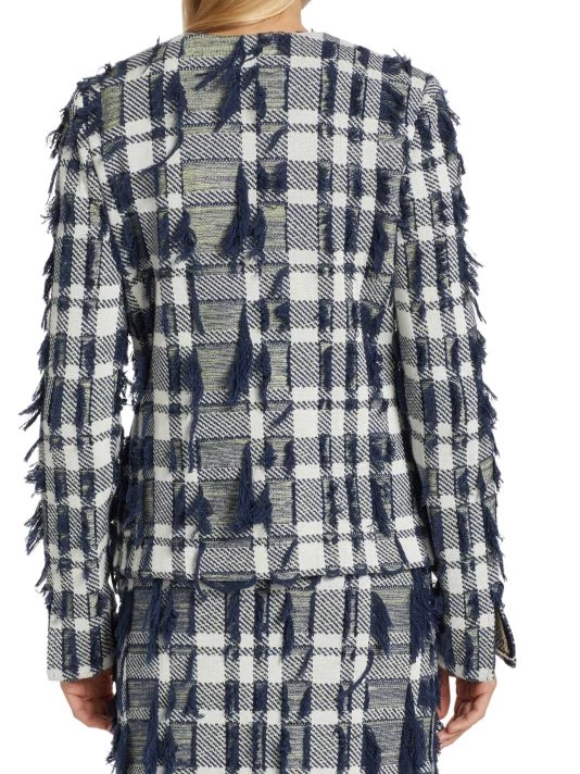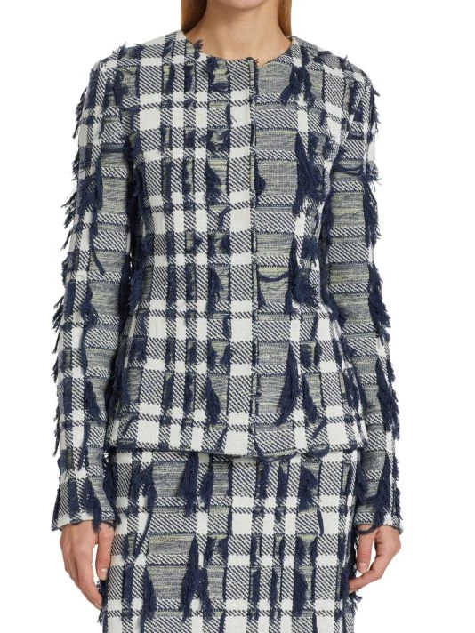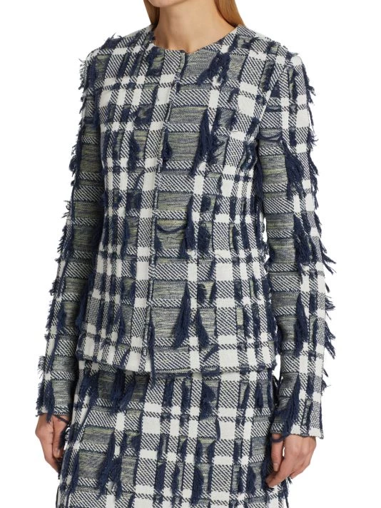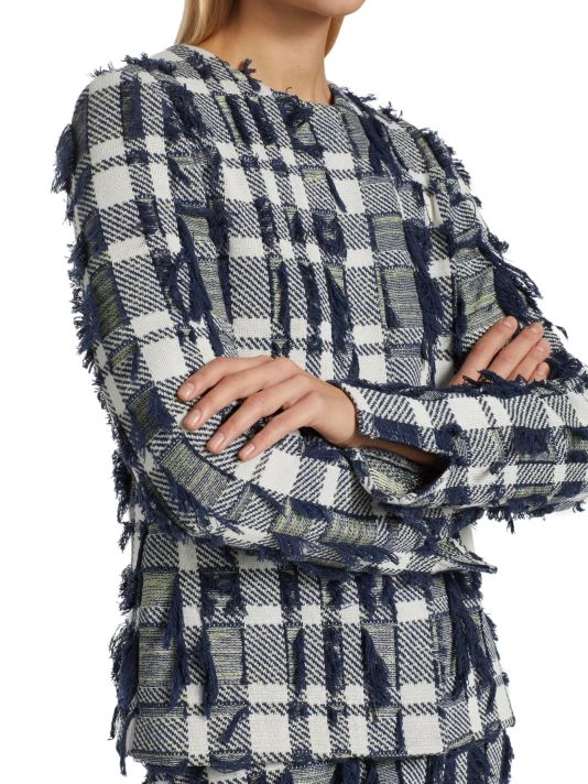 Cropped plaid jacket with textured tweed knitting and scattered tonal fringe trim.