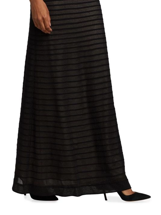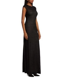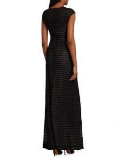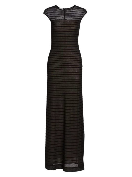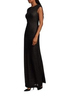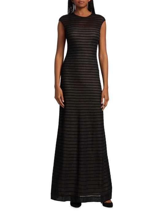 Degradé striping lends dimension to St. John’s sheer knit gown, designed with an A-line skirt.