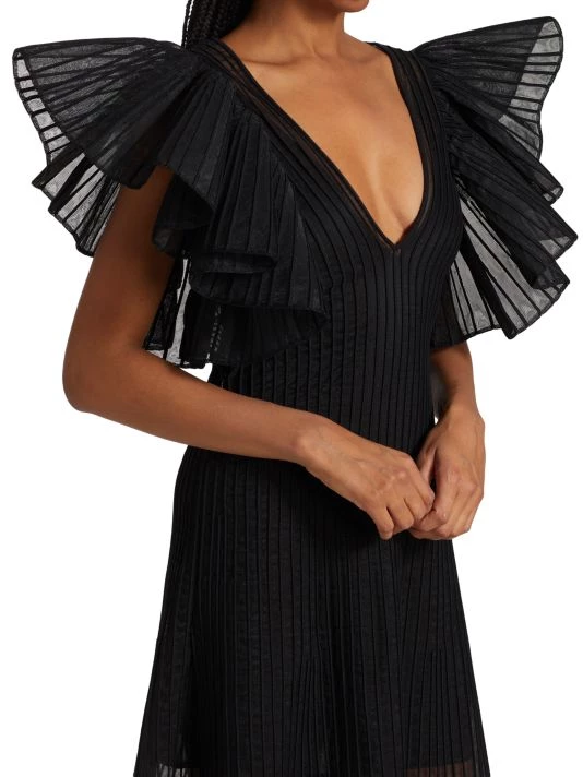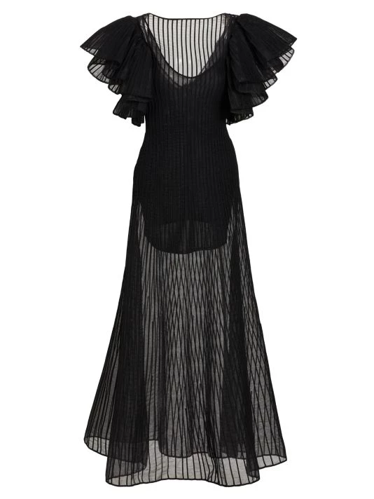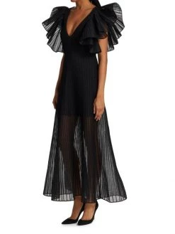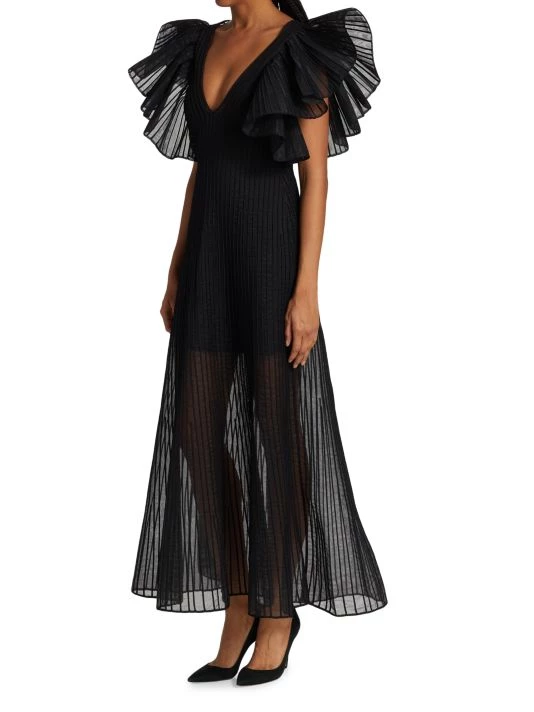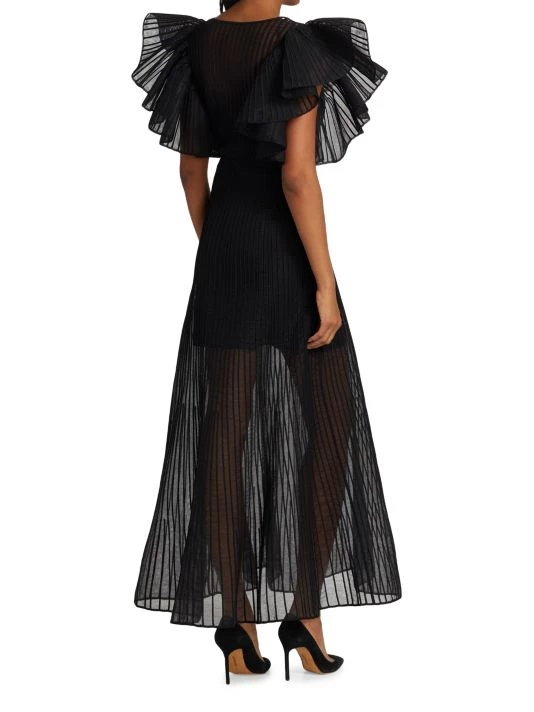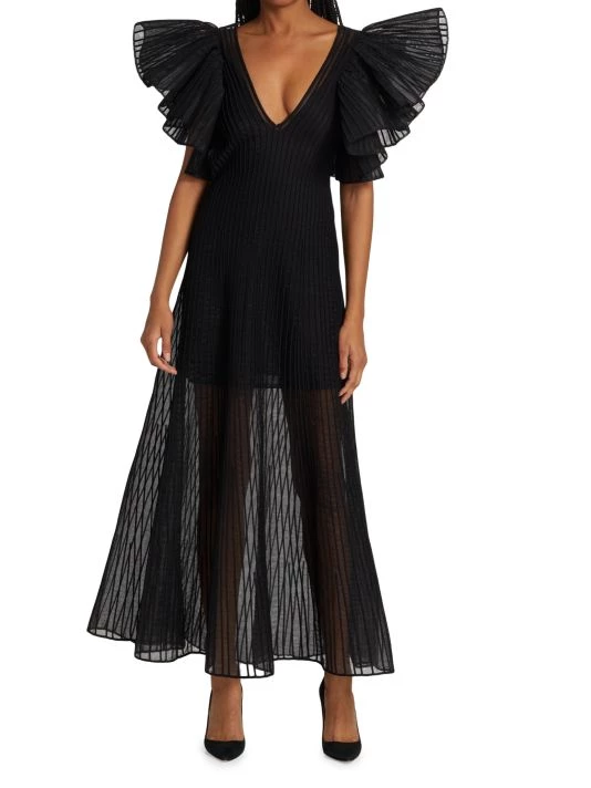 Cut in a flared silhouette, this semi-sheer maxi dress is defined by dramatic flutter cap sleeves.