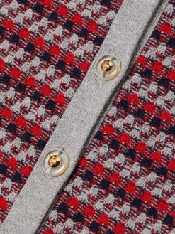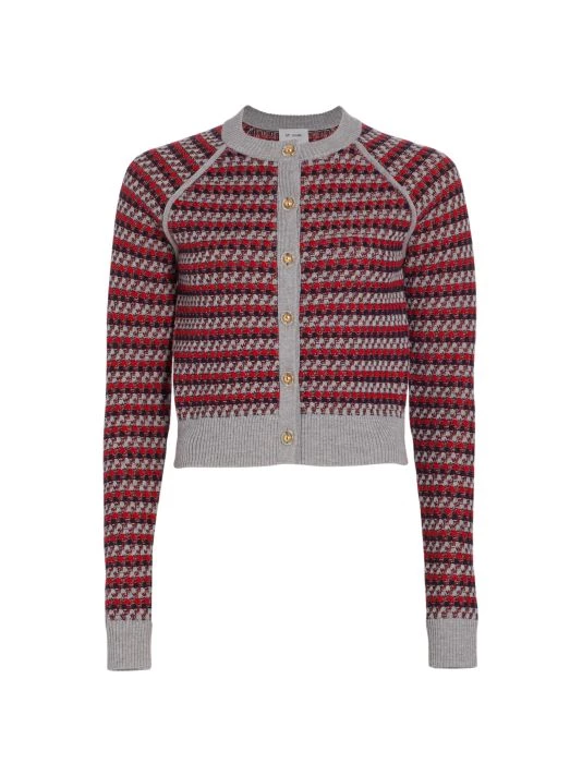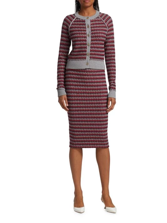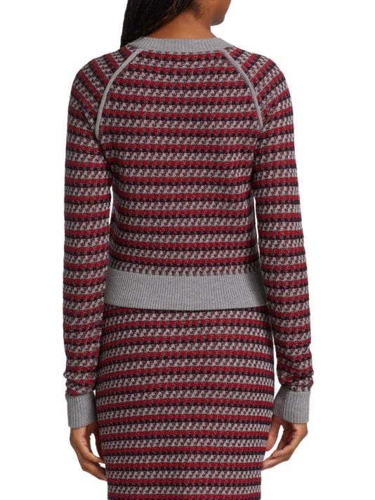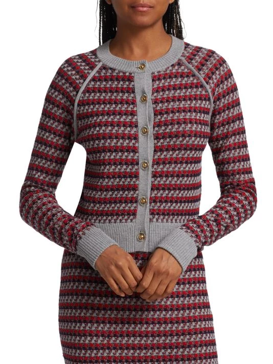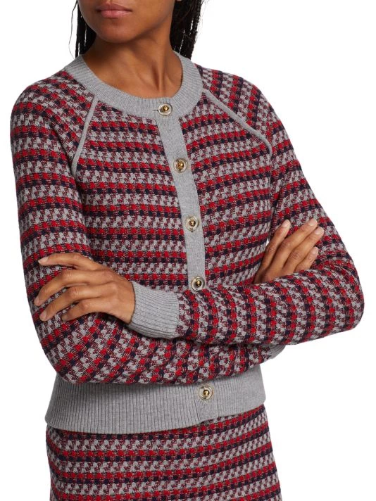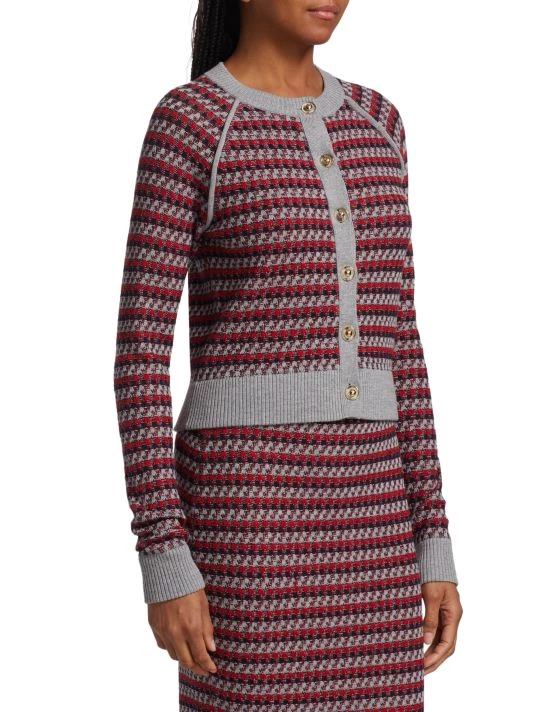 Intricate geometric stripes cover St. John’s wool-blend fitted cardigan.