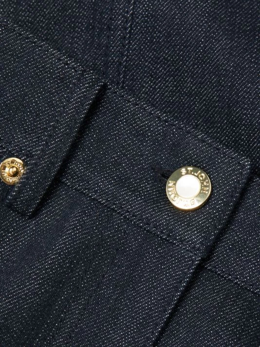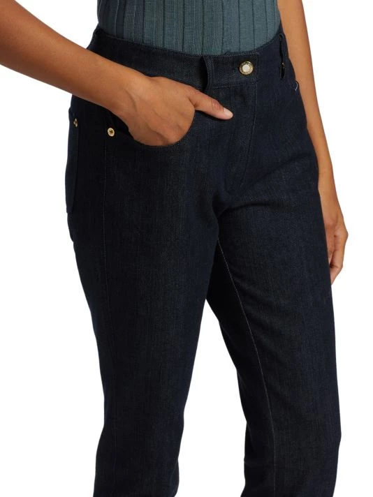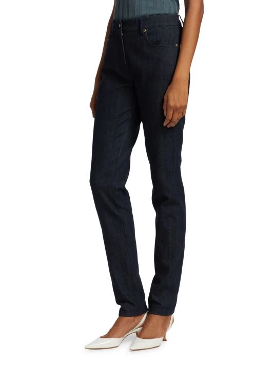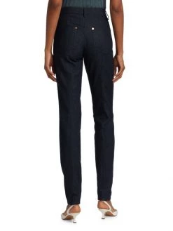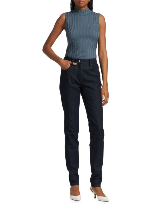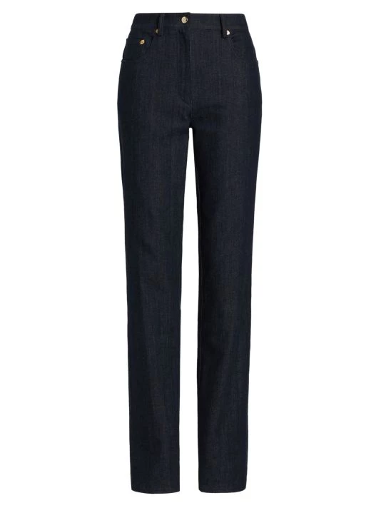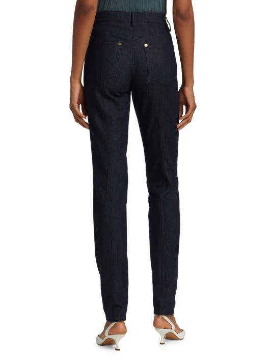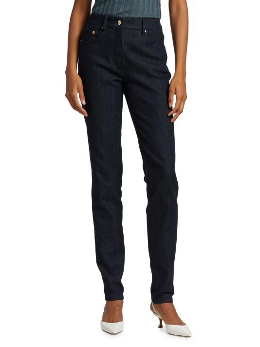 St. John’s high-waisted denim pants boast a slim leg and lustrous goldtone hardware.