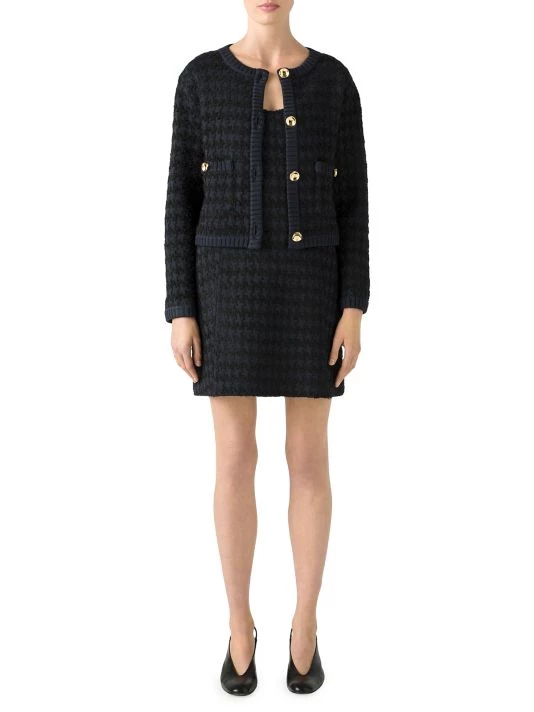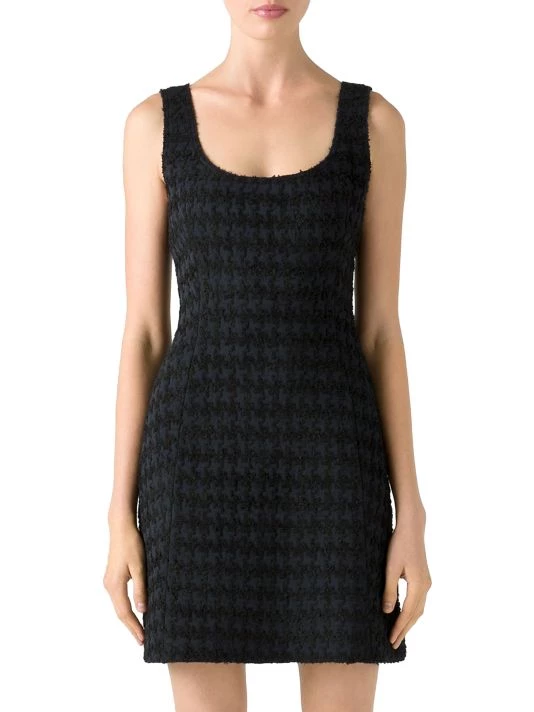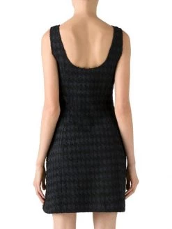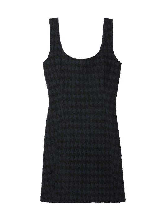 Sleek minidress with a houndstooth knit pattern, features a scoopneck and sleeveless design.