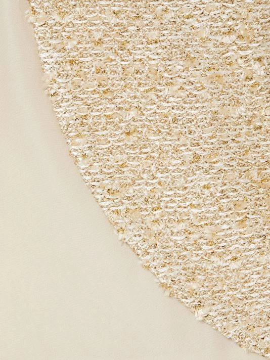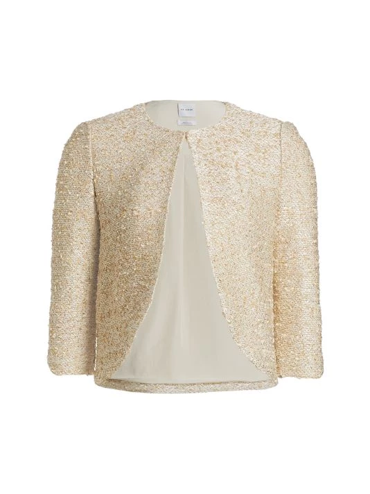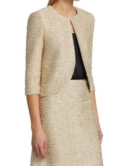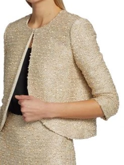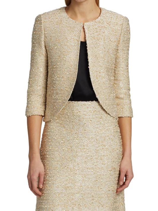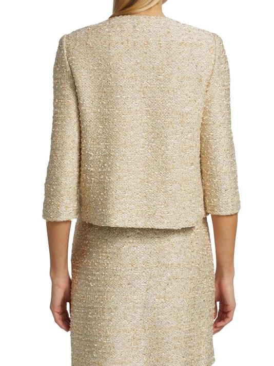 This chic eyelash tweed jacket shimmers with a metallic weave, framed the three-quarter sleeves.