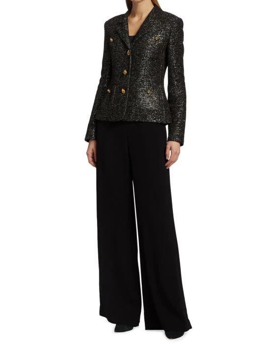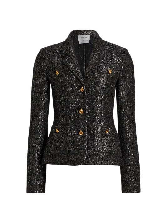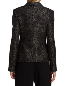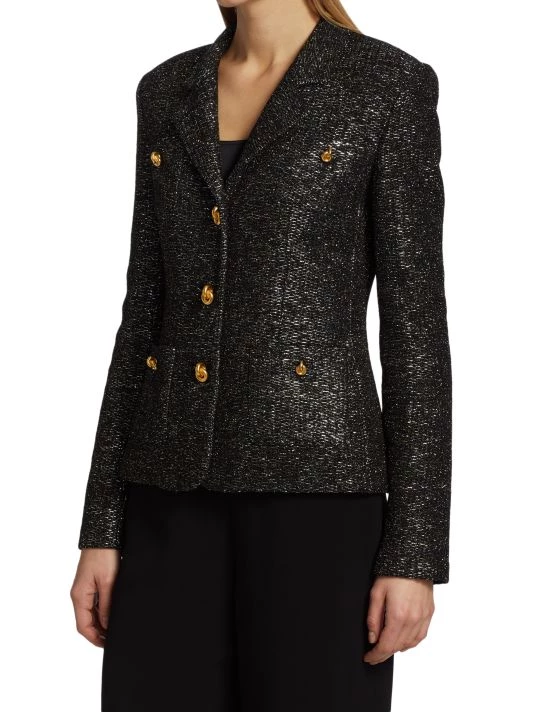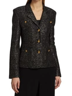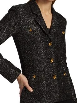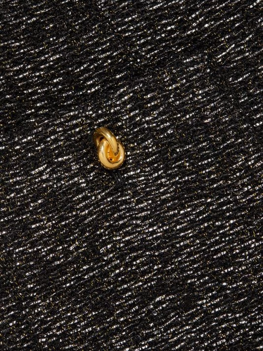 This metallic glitter knit jacket boasts knotted goldtone button closures.