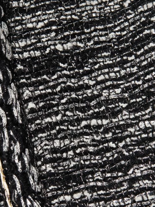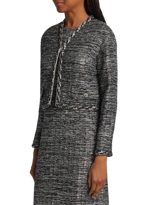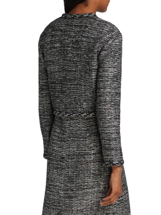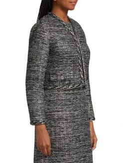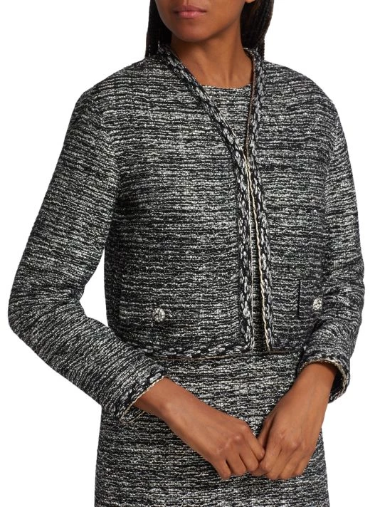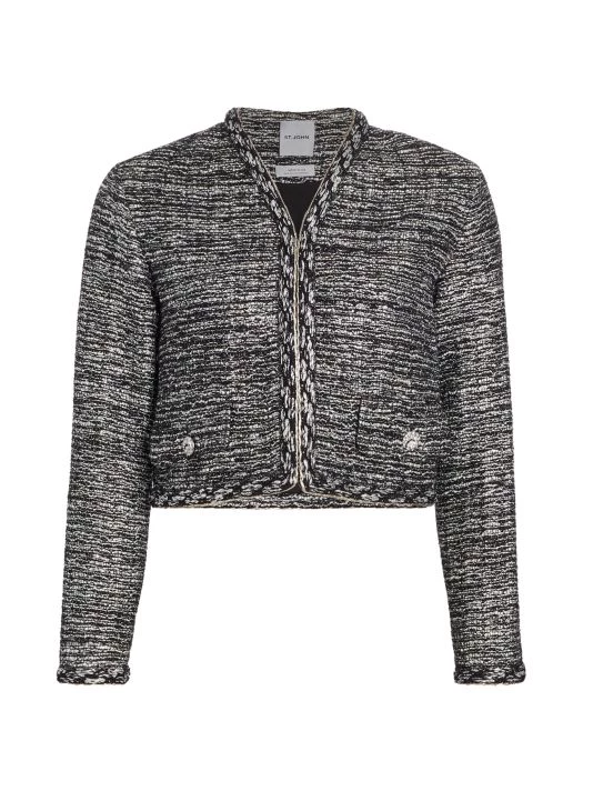 A sleek braid trims St. John’s bouclé jacket, designed with subtle metallic detailing for a bit of shine.