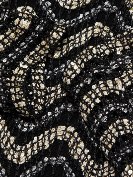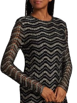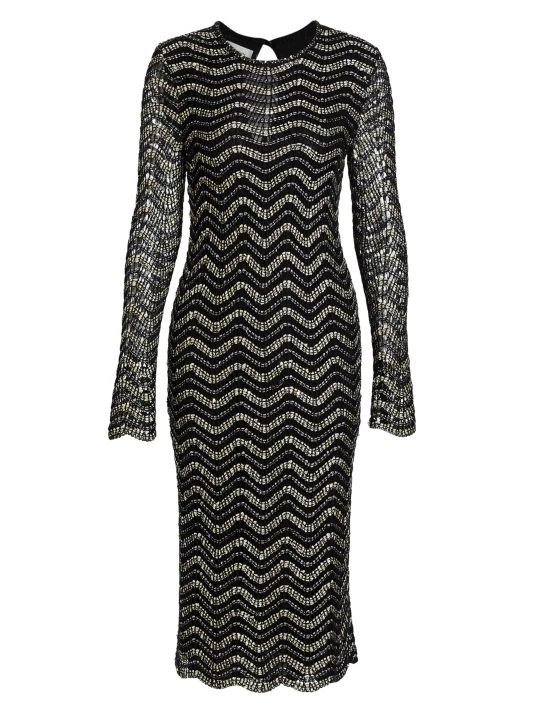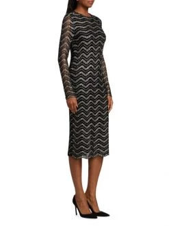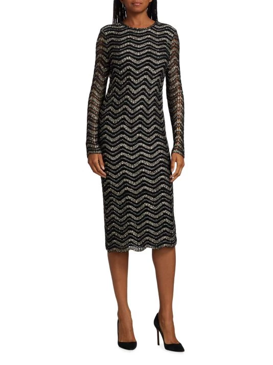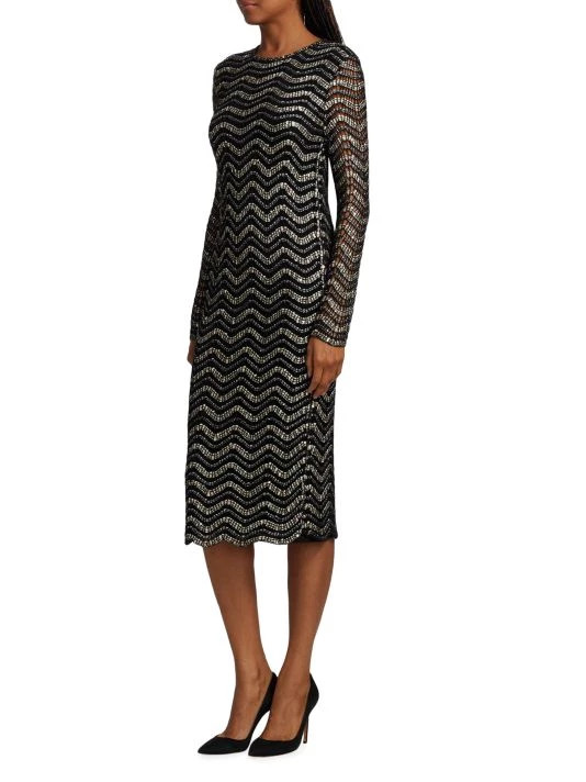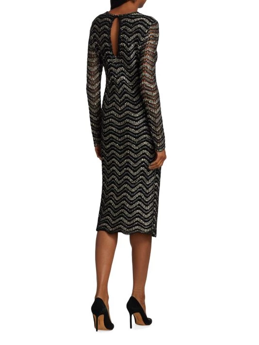 Metallic chevron stripes cover St. John’s lacy bodycon midi dress.