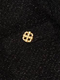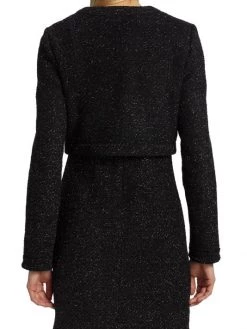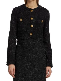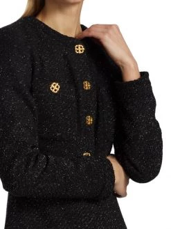 A metallic finish elevates St. John’s tailored tweed jacket, designed with goldtone buttons and a modern cropped fit.
