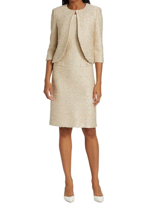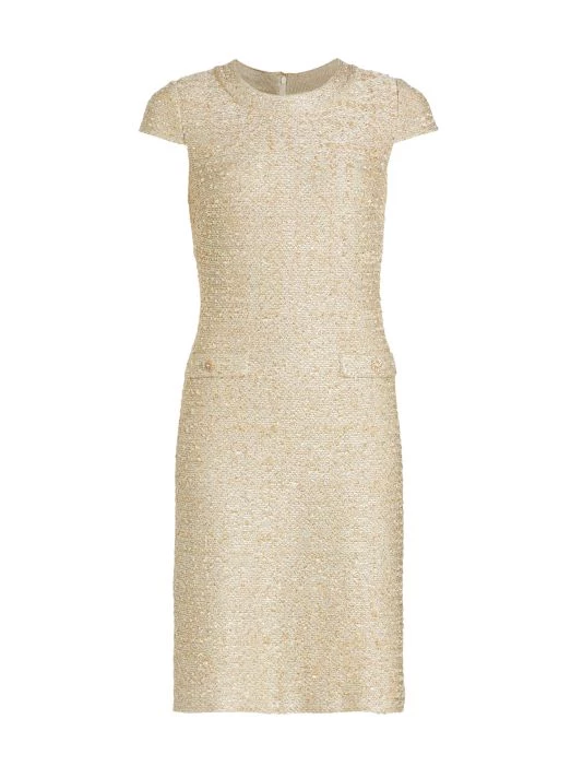 Knit from metallic tweed, this cap-sleeve knee-length dress is complete with waist welt pockets and crystal-embellished button closures.
