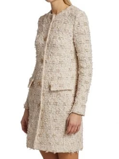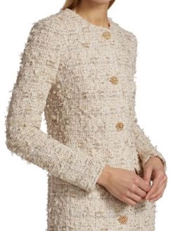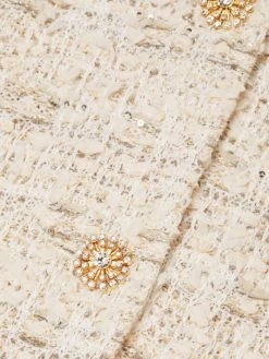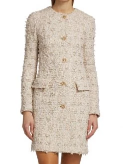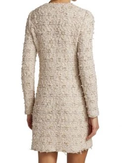 Crafted of sequin-embellished tweed, this long-sleeve minidress is defined by goldtone crystal button closures.