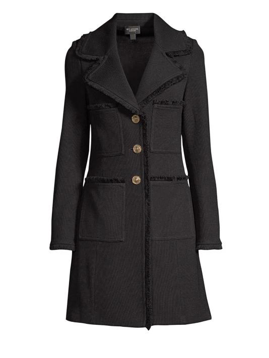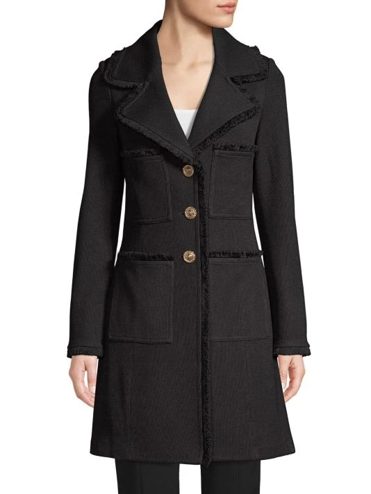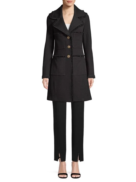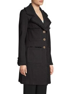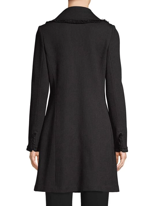 This rib-knit wool-blend coat’s svelte silhouette and minimalist design exudes timelessness and elegance. Crafted with a fringed trim, this piece lends fanciful flair to any ensemble.