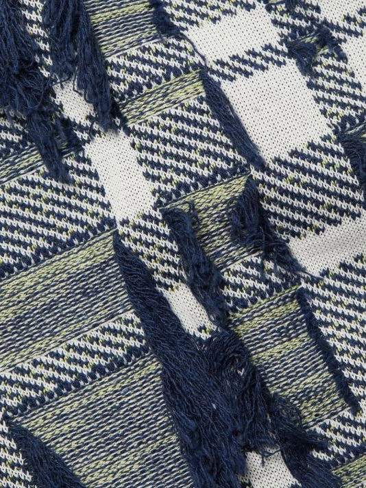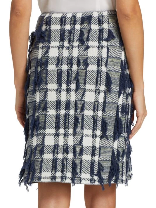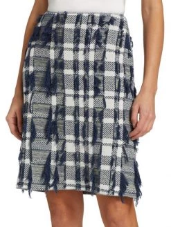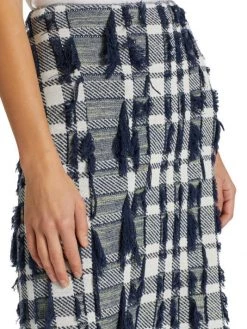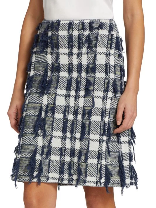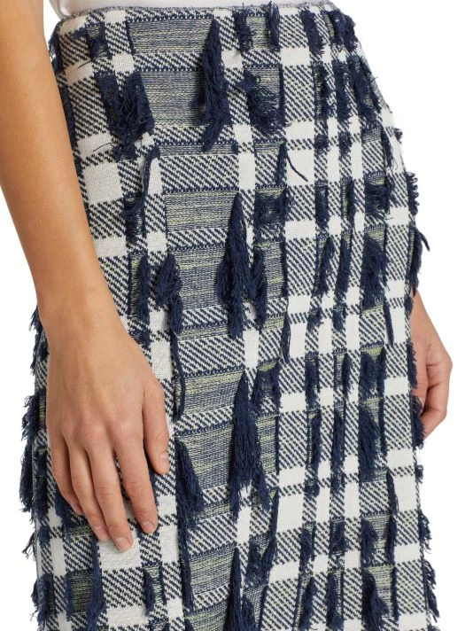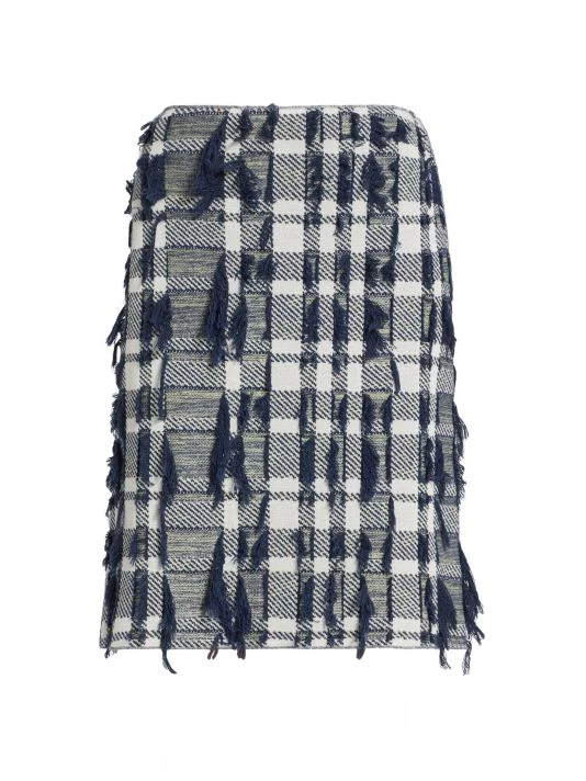 Tweed knit pencil skirt with plaid patterning and textured tonal fringe trim.