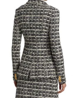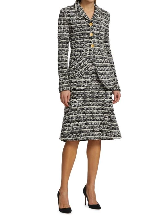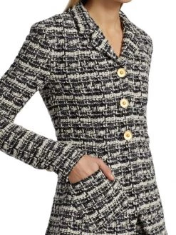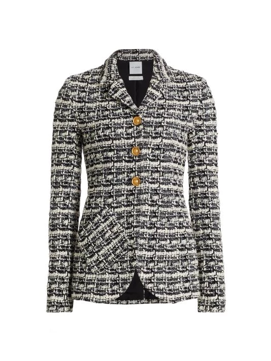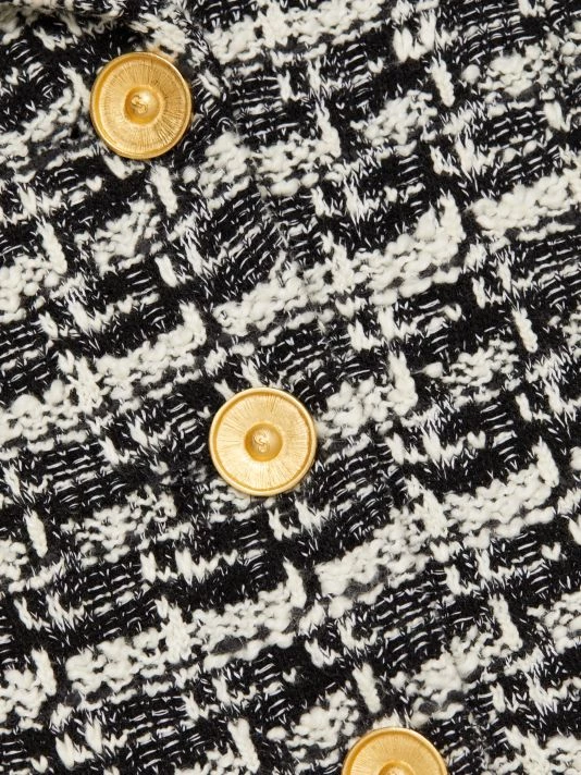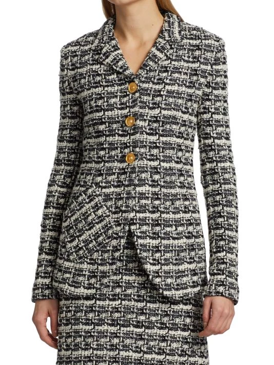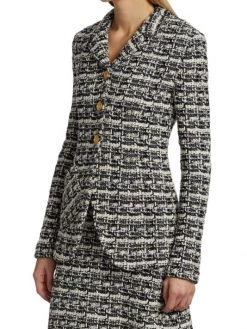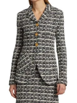This two-tone plaid tweed jacket is defined by luxe goldtone button closures.
