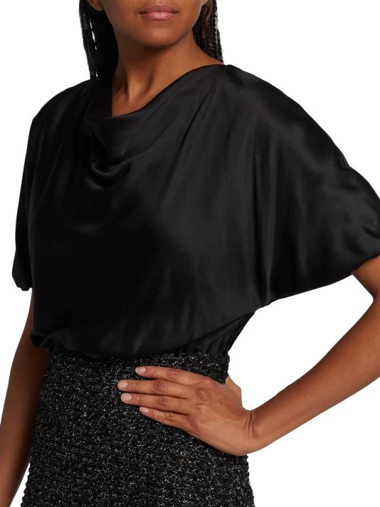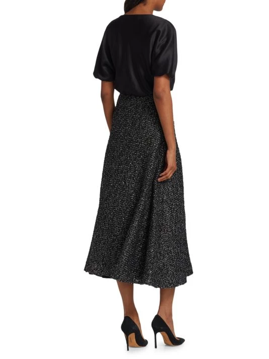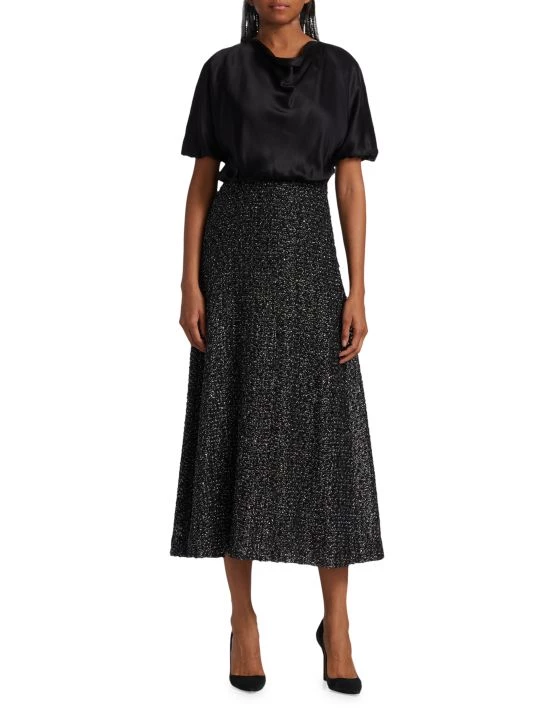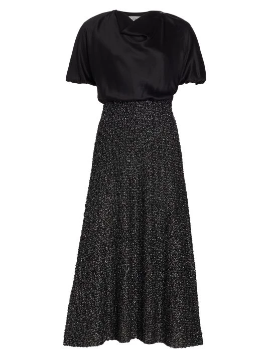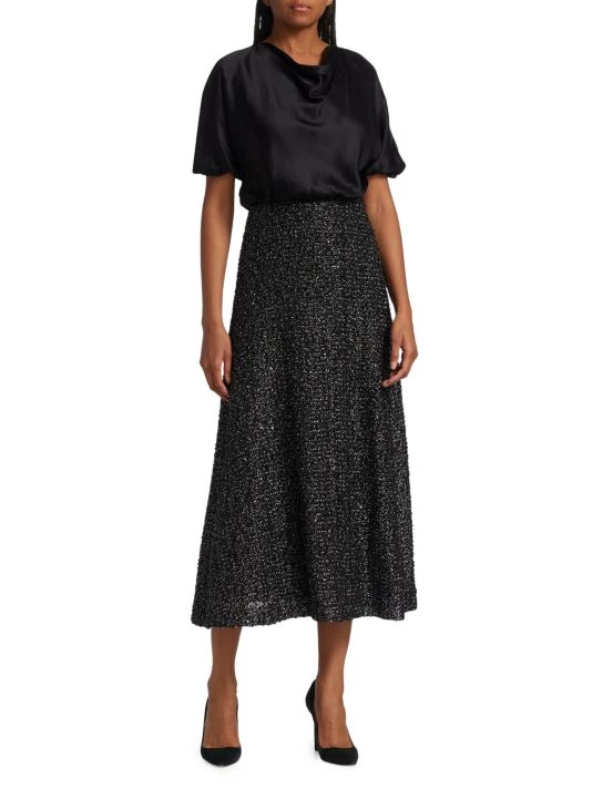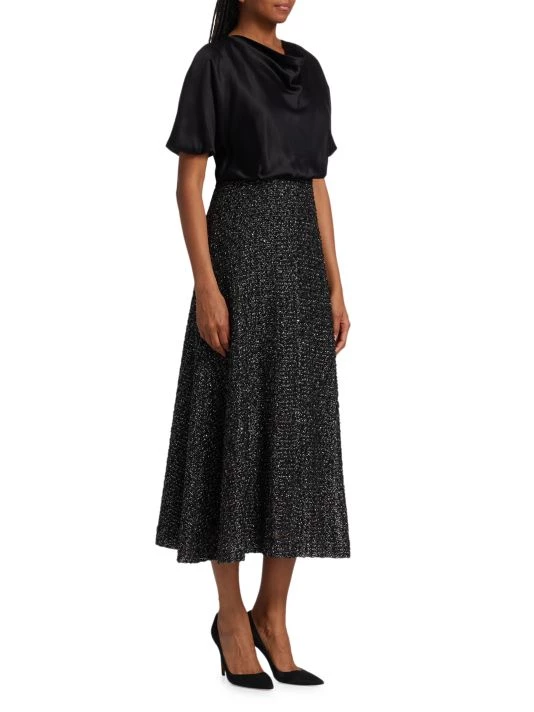 Designed with a pieced effect, St. John’s refined midi dress pairs an elegant silk top with a full A-line skirt.