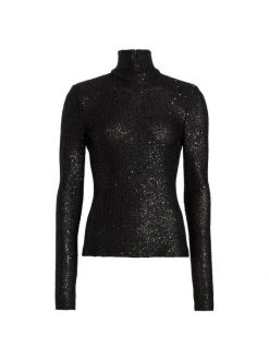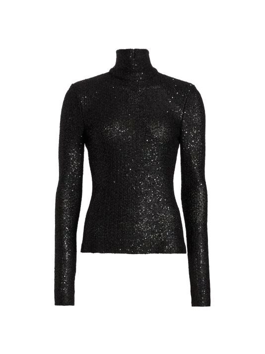 Decorated with scattered sequins, St. John’s glamorous knit top is detailed with a mock turtleneck and long sleeves.