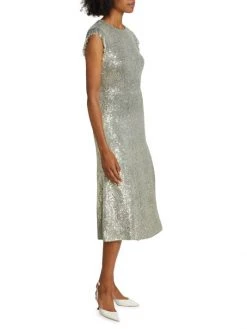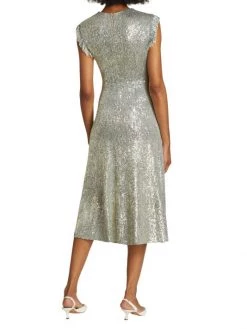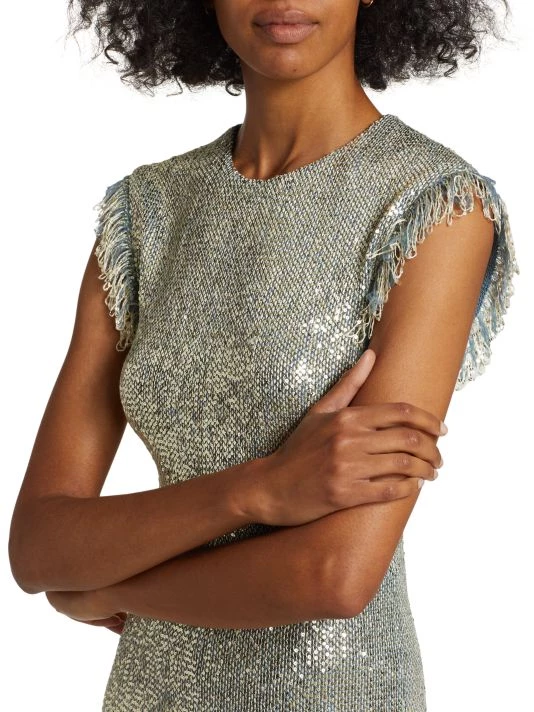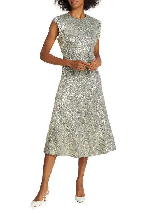 Decorated with sparkling sequins, St.John’s fit-and-flare knit dress features a round neck, fringed cap sleeves, and a midi-length hem.