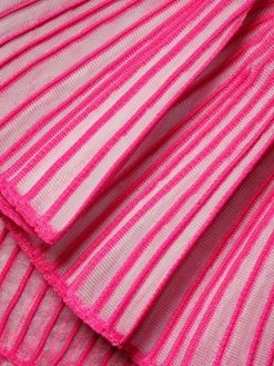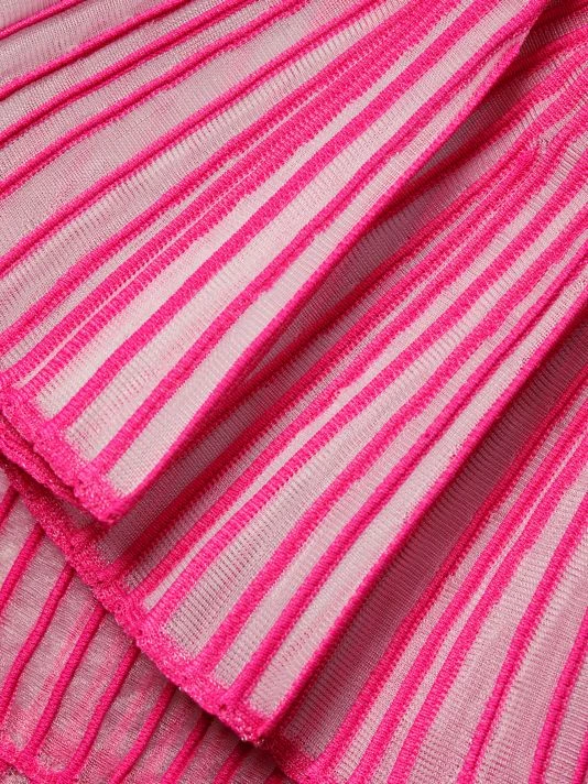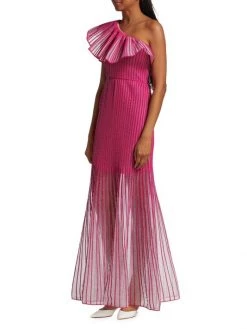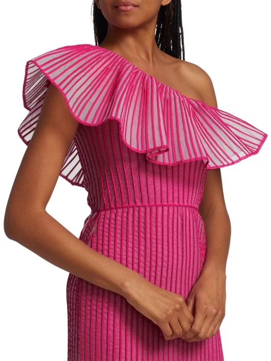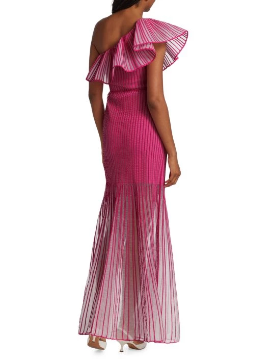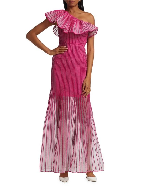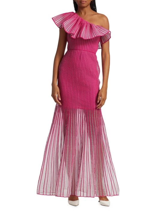 St. John’s whimsical ruffle-trim gown is designed with sheer detailing and textured stripes for dimension and shape.