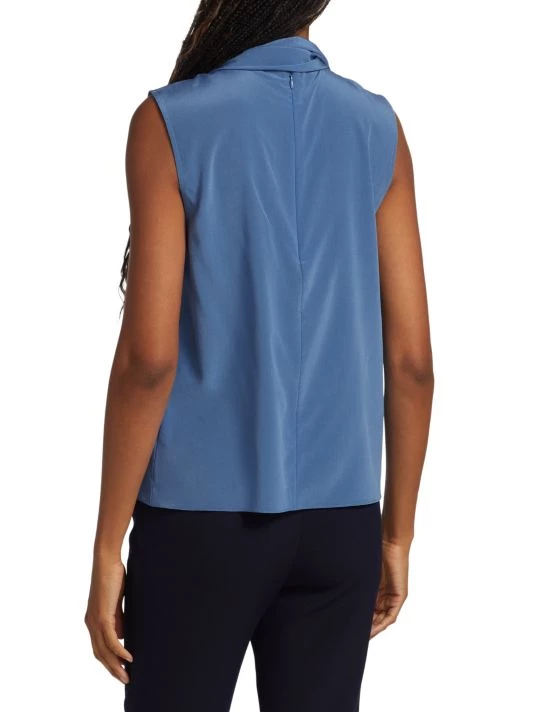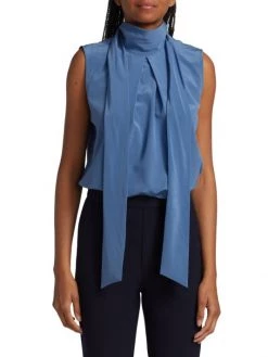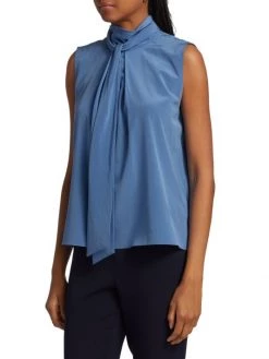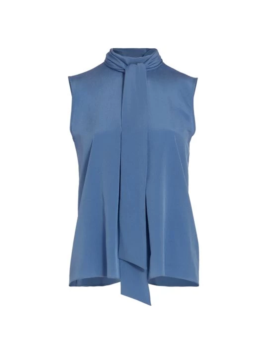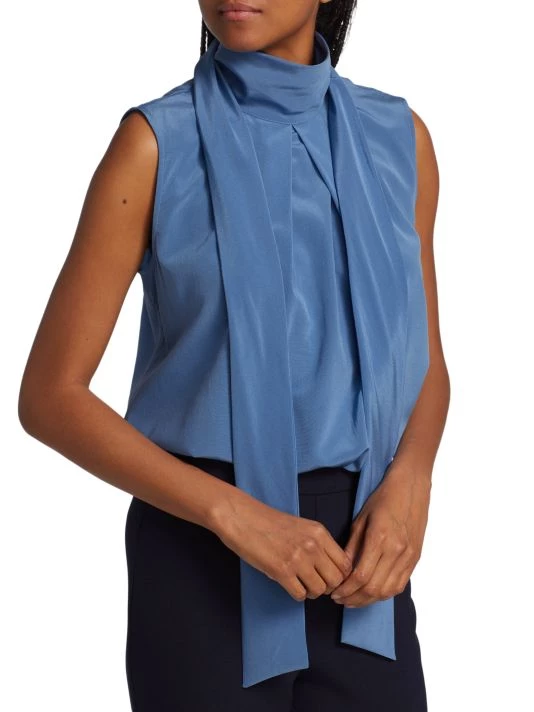 An elegant tie neck tops St. John’s silk crepe de chine blouse.