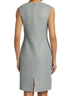 This sleeveless knee-length dress boasts metallic glitter knitting and raw trim.