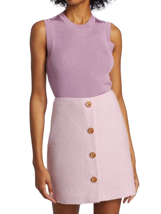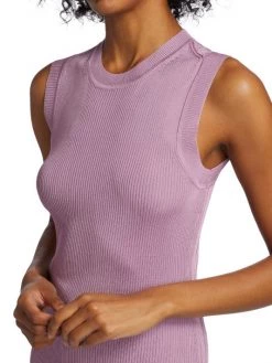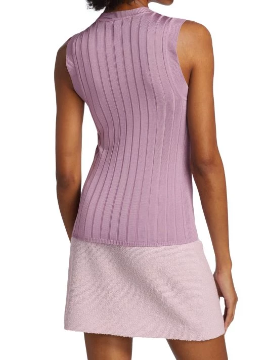 Form-fitting sleeveless pullover top with mixed textured rib knitting and contrast banded trim.