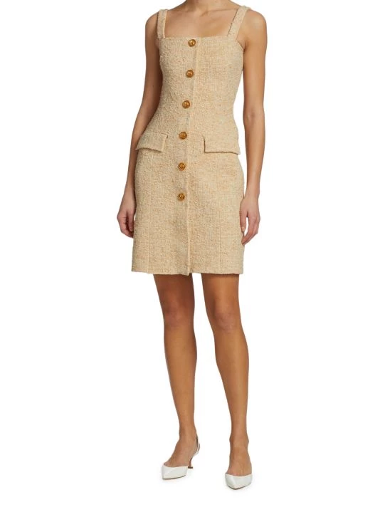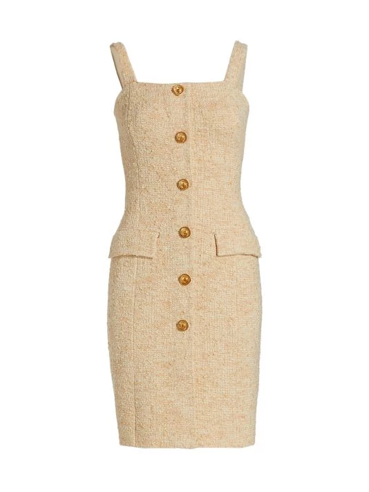 Finished with goldtone buttons, St. John’s body-hugging stretch bouclé knit dress is detailed with a square neck and dual flap pockets.