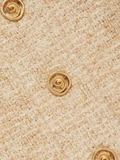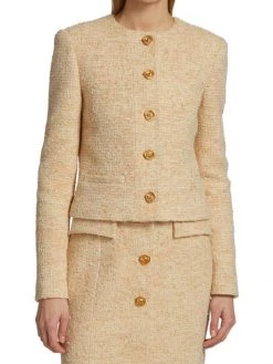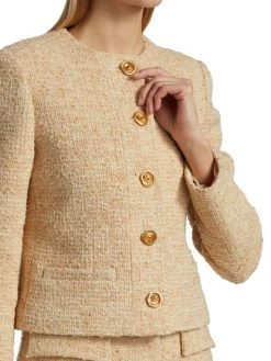 Cut for a tailored fit, St. John’s stretch bouclé knit jacket features a crewneck, long sleeves, and dual welt pockets.
