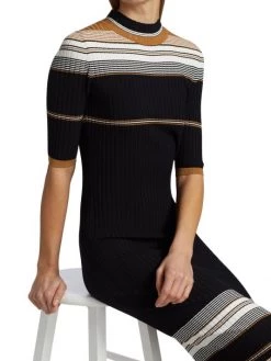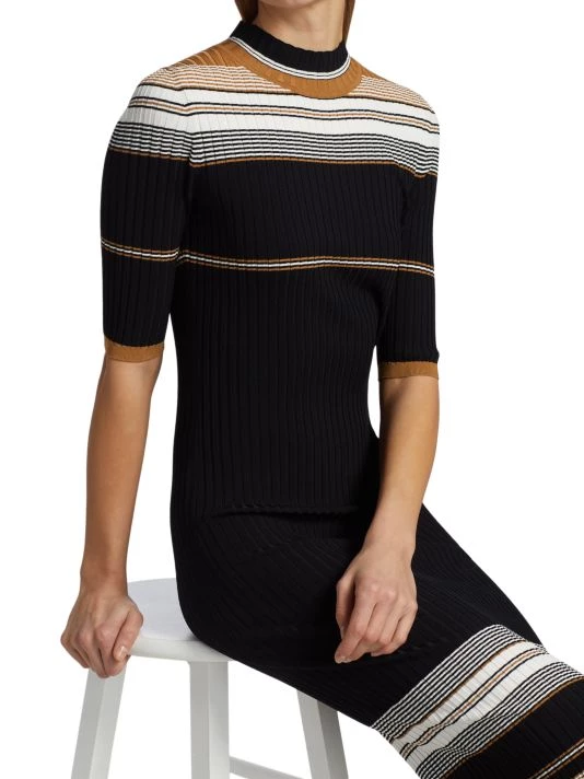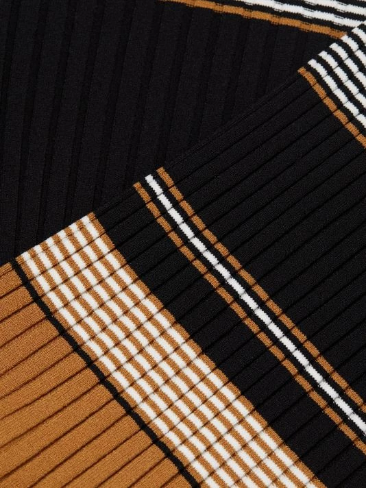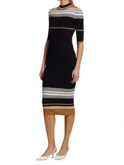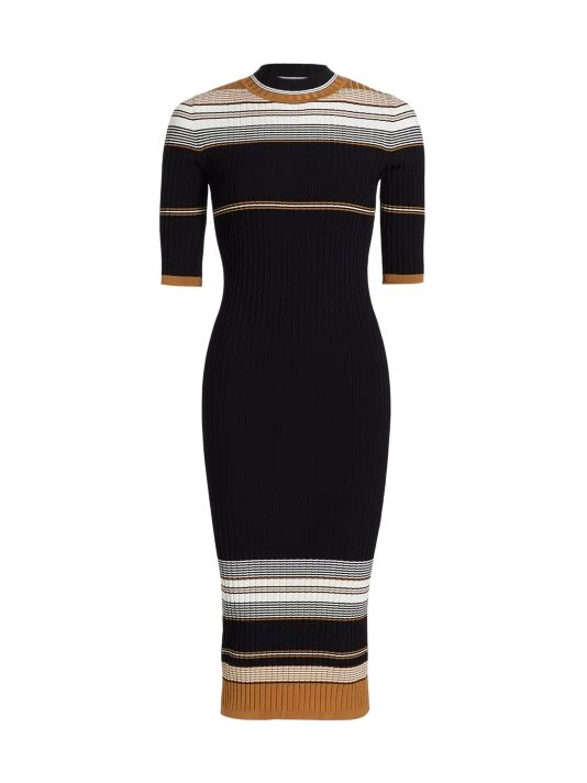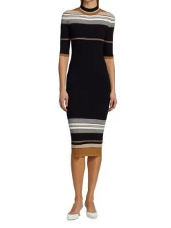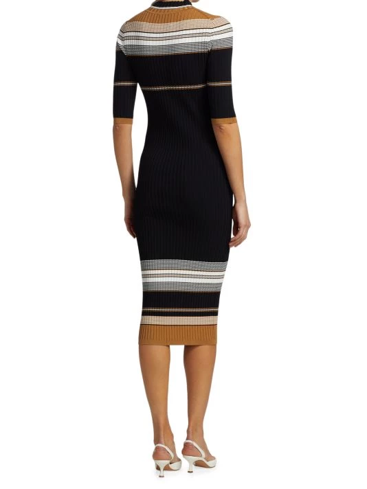 Cut in a body-con silhouette, this ribbed-knit midi-dress is complete with colorblocked striping.