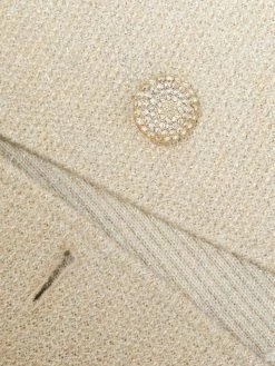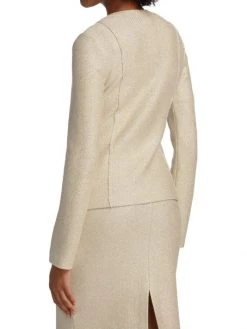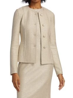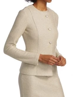 Frayed seaming adds dimension to this tailored metallic jacket, designed with shimmering embellished buttons.