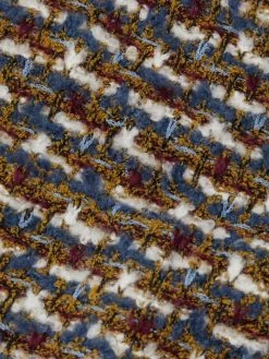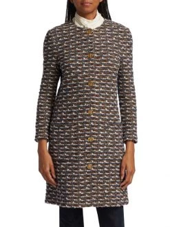 Metallic buttons center St. John’s tailored jacket, crafted from multicolor tweed bouclé.