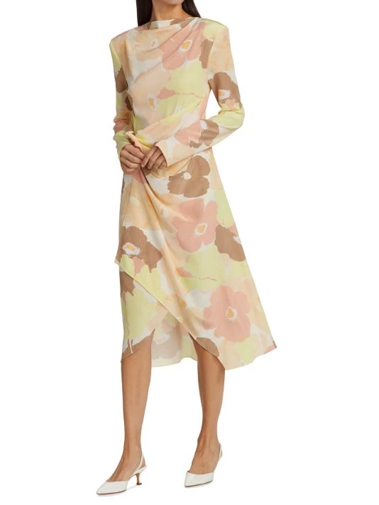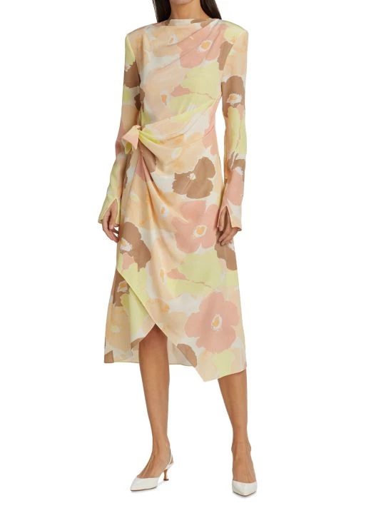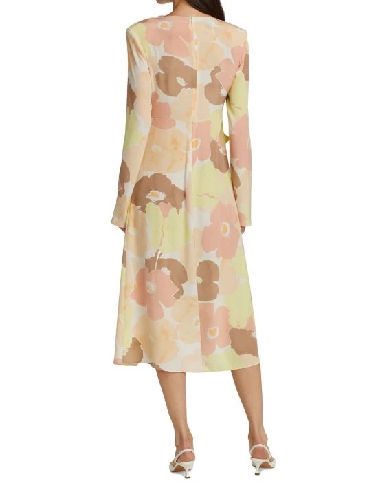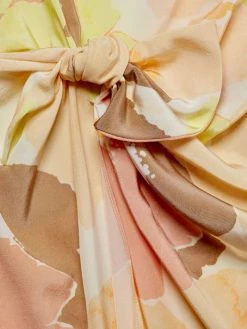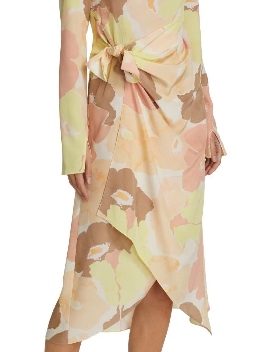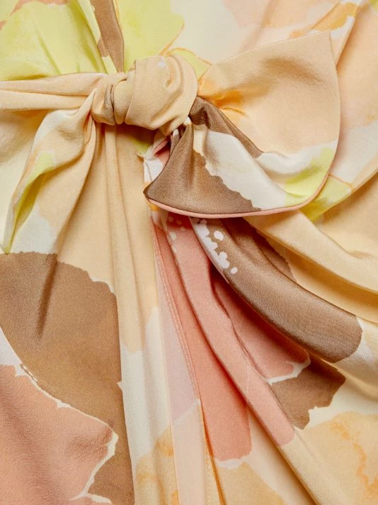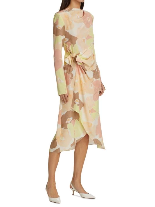 Silk midi-dress with watercolor floral print and a flattering, knotted waist.